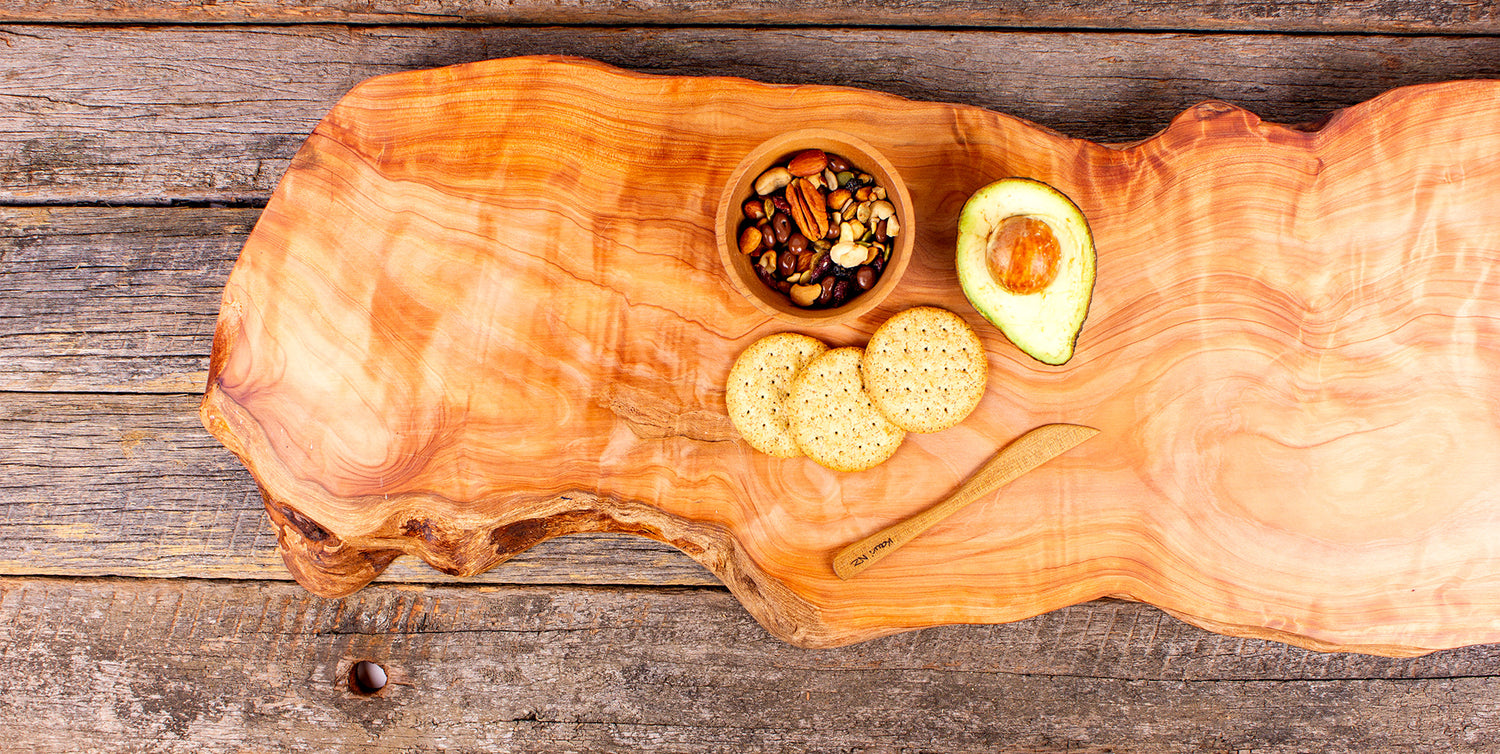 Macrocarapa is a great choice for use in the kitchen, this timber has a good natural ability to kill bad bacteria cleansing itself, assisting with hygiene around food it has a nice scent, blonde golden colour and good stability medium density and hardness, light weight and attractive grain. We source logs from old mature trees for the best quality wood, cut specifically for the products we make.