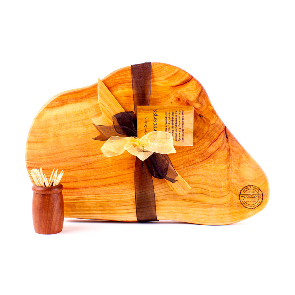 This board has been expertly selected from crowns and stumps of sustainably sourced Macrocarpa trees. Featuring a unique natural edge and shapes from the original log or stump, and a distinctive glow which will leave you mesmerised.